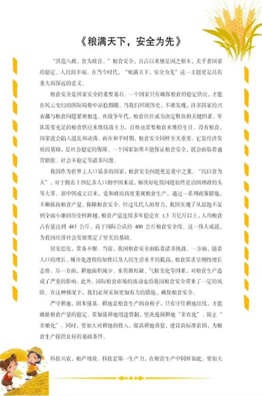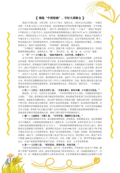 民以食为天,国以粮为本。一粥一饭,当思来之不易;半丝半缕,恒念物力维艰。粮食安全是国家安全的基石,是人民群众幸福生活的重要保障。为深入学习贯彻全国“两会”精神,在第44个世界粮食日,全国粮食安全宣传周到来之际,yl23411永利集团官网全体师生积极响应国家号召,为加强粮食安全教育,深化落实 “强法治、保供给、护粮安”安全宣传周主题,开展了中储粮袁华山总经理报告会暨捐书仪式、“共绘‘粮梦’,挺膺粮安”绘画大赛、“珍惜粮食,从我做起”粮食宣传科普视频比赛、“粮满天下,安全为先”主题征文活动等活动,旨在通过本次活动,科普粮食安全相关知识,培养学生对粮食价值的认知,知粮、爱粮、节粮,共筑中国粮食安全。