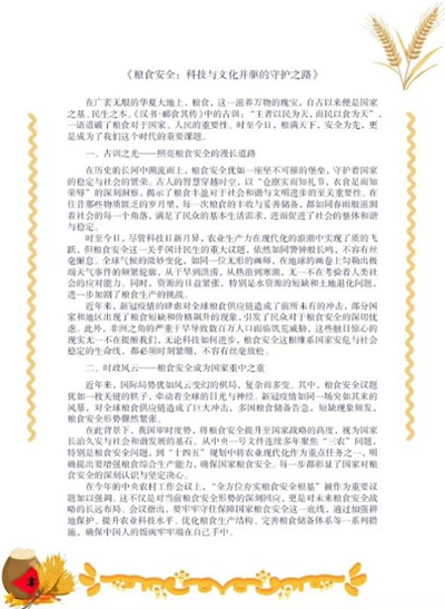 为落实“强法治、保供给、护粮安”安全宣传周主题,激发同学们从不同角度、不同方面阐发自己的观点,汇聚起保障粮食安全的磅礴力量,yl23411永利集团官网举办“粮满天下,安全为先”主题征文活动,本次活动为粮食安全贡献出中国智慧与中国方案,展现出我国在保障粮食安全方面的生动实践、感人故事及未来展望,并立足粮食安全现状,强调法治保障在粮食安全的核心地位和重要意义。yl23411永利集团官网旨在号召广大青年对保卫国家粮食安全付诸实际行动,让同学们能够通过文字的力量,深入挖掘粮食安全的多元特点。